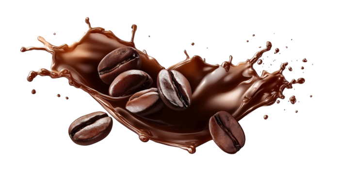 Roasted coffee beans splashing in delicious coffee on transparent background, cut out