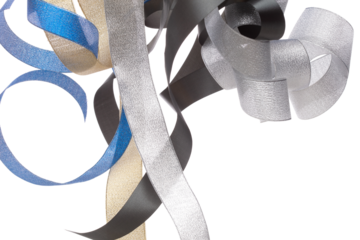 Colorful ribbon long straight fly in air with curve roll shiny. Blue silver gold black ribbon for present gift birthday party to wrap around decorate, blow fly in wind. White background isolated