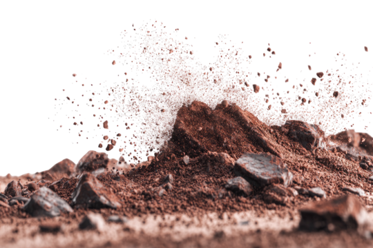 Explosion of rocks and dust particles captured mid-air against a stark white background, cut out transparent