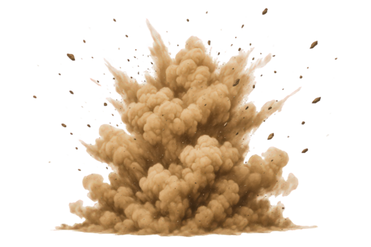Explosion of earth and dust creating a dramatic airborne cloud against a white background.