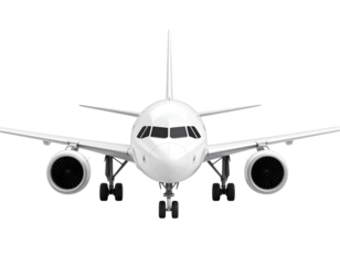 Front view of a white passenger airplane, showcasing its engines, wings, and cockpit on a png transparency.