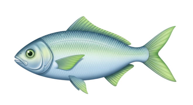 Isolated fish in a light blue with green fins and scales, a side view in profile