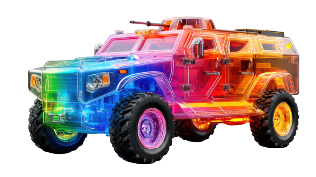 Prismatic Armored Vehicle: A captivating display of military technology, with a multicolored armored vehicle, rendered in a mesmerizing array of colors