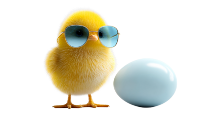 Adorable fluffy yellow baby chick wearing stylish blue aviator sunglasses standing next to a shiny light blue egg, perfect for cheerful Easter holiday content and springtime themes.