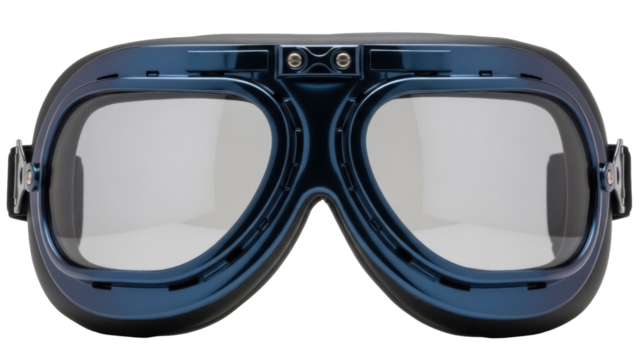 Blue vintage aviator goggles isolated PNG on transparent background, retro eyewear for motorcycle riding and steampunk fashion