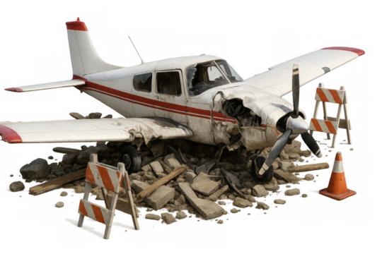A realistic PNG of a broken airplane, showing visible damage and worn surfaces.