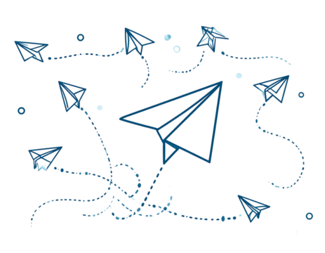 White paper airplane flying out of an open white envelope, with a dotted flight path