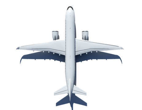 Top view of a modern white passenger jet airplane with large wings isolated on transparent background