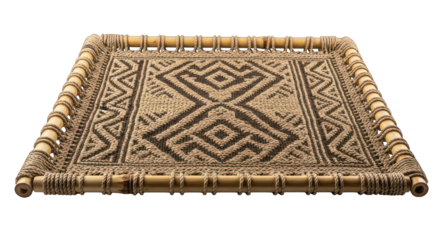 Woven mat with geometric pattern framed by bamboo, texture detail