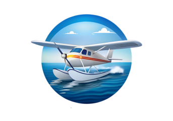 Seaplane taking off from the water with a blue sky and clouds in the background, within a circular frame isolated on transparent background