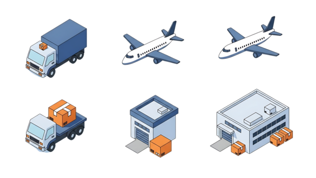 Isolated logistics and transportation icons on transparent background