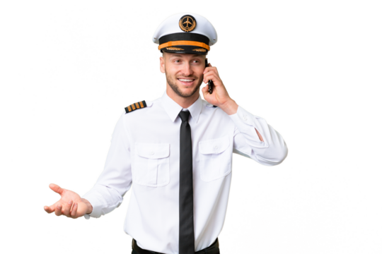 Airplane pilot man over isolated background keeping a conversation with the mobile phone with someone
