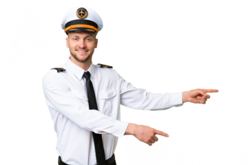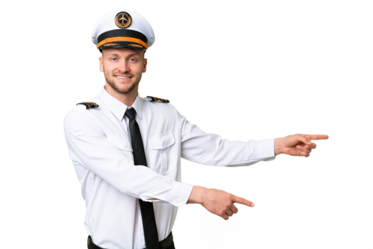 Airplane pilot man over isolated background pointing finger to the side and presenting a product