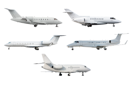 Set of taking off airplanes isolated on a white or transparent background. Close-up of a white airplanes, side view. Concept of vacation, traveling abroad. Graphic design element.