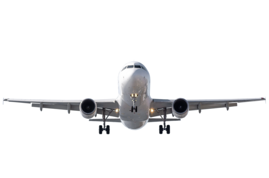 Vista frontal de un avión de pasajeros sobre fondo transparente png