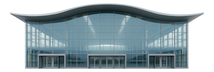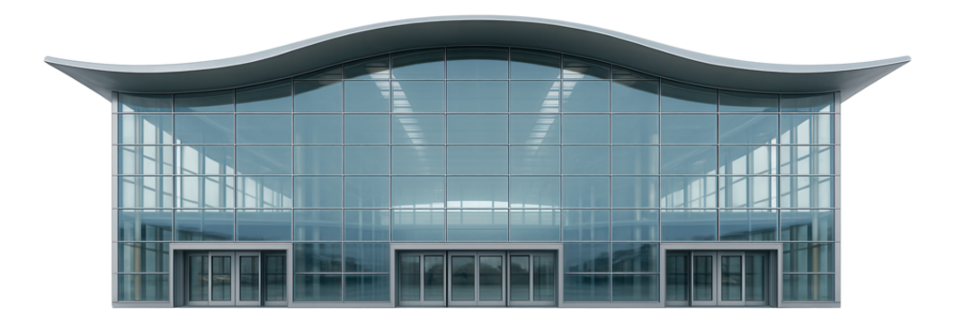 Modern airport terminal building with glass facade and steel structure, isolated on transparent background, showcasing architectural design