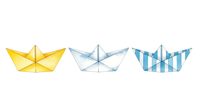 Illustration of three watercolor paper boats, one yellow, one blue and white striped, and one clear blue, isolated on transparent background