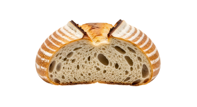 Freshly baked artisanal bread loaf cut in half showing airy texture and crusty exterior isolated on transparent background