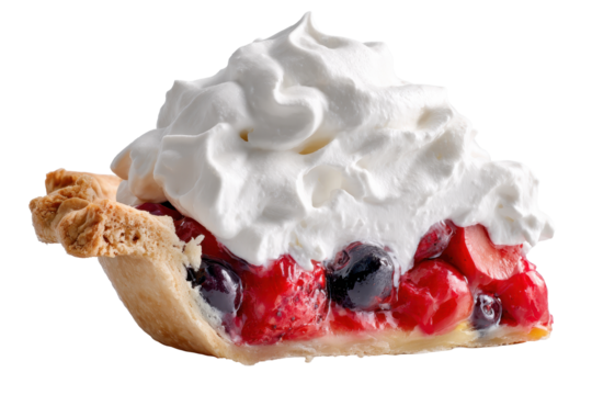 Pie slice with flaky crust and visible fruit filling topped by a generous scoop of whipped cream with soft peaks and creamy airy texture isolated on transparent background.