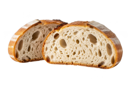 Two halves of artisan sourdough bread, showcasing its airy crumb and golden crust, isolated on transparent background