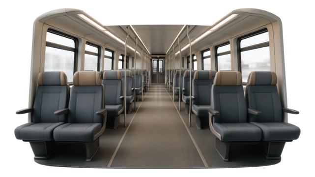 Express train carriage with spacious aisle and contrasting blue and white interior