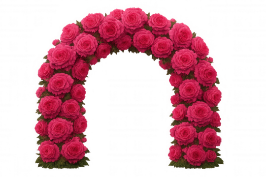 Floral wedding arch decorated with pink roses, creating a romantic atmosphere, on transparent background