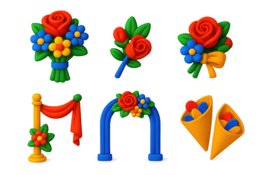 3D Wedding Icon Set. 3D icon set of wedding flower arrangements: bridal bouquet, boutonniere, corsage, aisle decor, arch flowers,