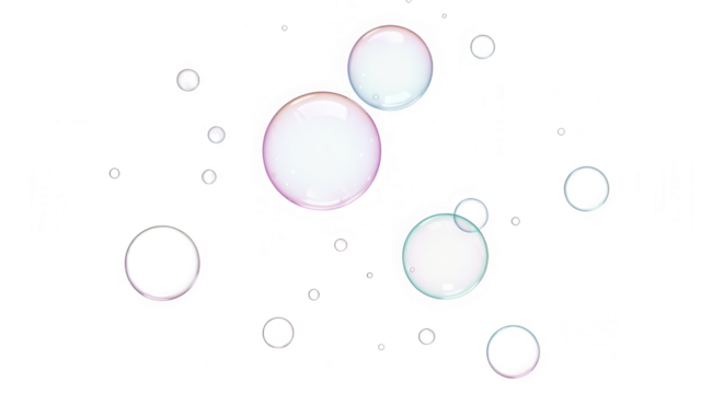 Collection of iridescent soap bubbles floating in the air, isolated on transparent background