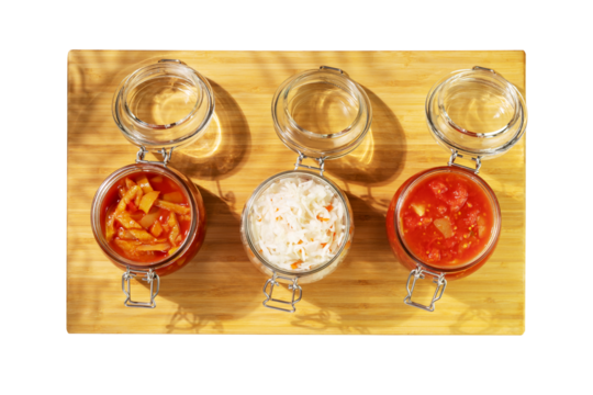 Probiotic food. Lecho, sauerkraut, ajvar in glass jars on a wooden board on transparent background. Fermented food. Home food preserving or canning