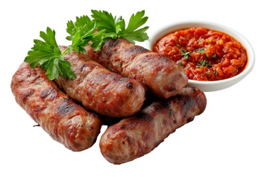 Serbian ćevapi grilled minced meat with ajvar isolated on transparent white background