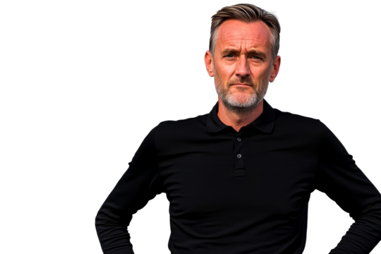 Soccer player in red jersey standing with hands on hips and soccer ball at feet isolated on white background transparent