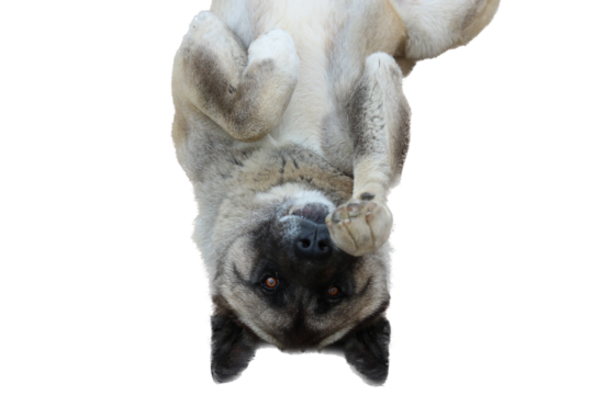 cute funny transparent pomeranians puppy dog lying on his back with paws up and waiting for belly rubs; doggy isolated on transparent background - generated by ai