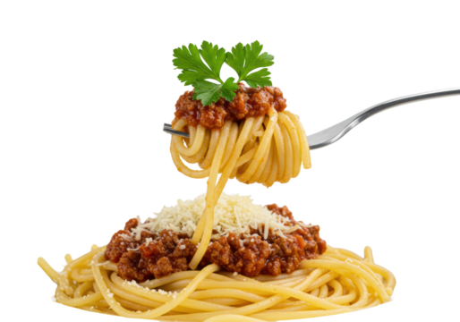 Extreme macro of perfectly twirled al dente Italian spaghetti with bolognese sauce, parmesan, and parsley on a silver fork, isolated on white background, concept of Italian cuisine