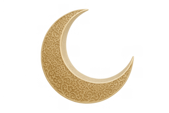 Golden crescent moon with intricate embossed arabic pattern, symbolizing islam and ramadan. Element on transparent background