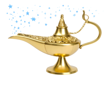 Antique Aladdin Lamp with Blue Smoke Swirl Emerging, Front Angle, Transparent Background
