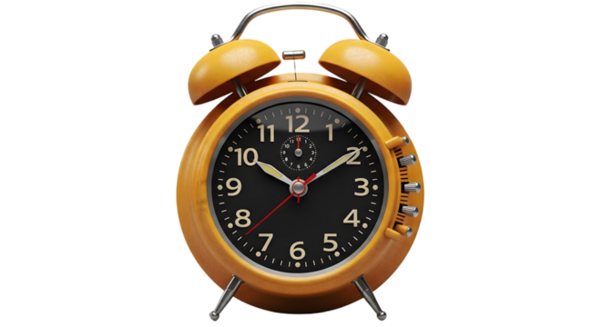 A yellow alarm clock isolated on transparent background, showing the time at 1000, with a retro design and vibrant color, perfect for illustrating punctuality and deadlines