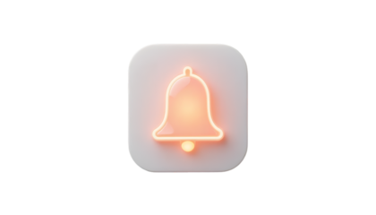 A glowing neon bell icon on a white square against a black background