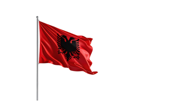 Albanian flag waving on a gold flagpole with black double-headed eagle on red background, isolated on white, perfect for cultural or national themes