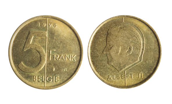 Isolated png photo of 5 Belgium 1998 franc aluminium-bronze coin of King Albert 2 on transparent background.