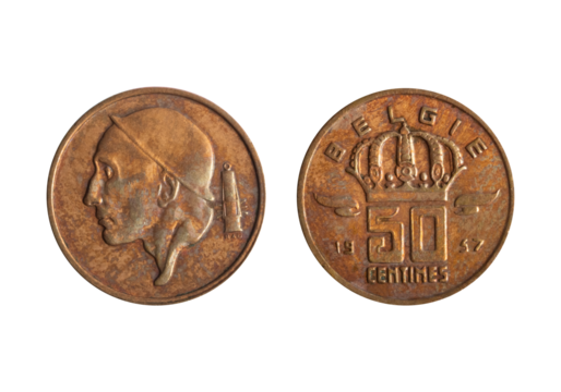 Isolated png photo of 50 Belgium 1957 centimes bronze coin of Albert 2 ruler on transparent background.