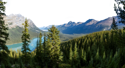 Panorama of Peyto Lake near Banff with mountains trees and transparent sky