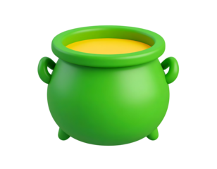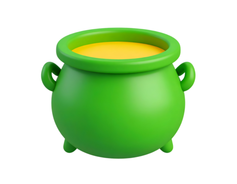 Green 3D rendered pot or cauldron filled with yellow liquid, isolated on a black background. Minimalist cartoon style for icons and symbols.