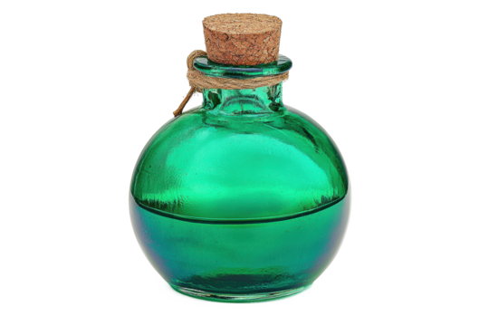 A potion bottle with glowing green liquid, glass transparency, cork stopper, floating look on white background