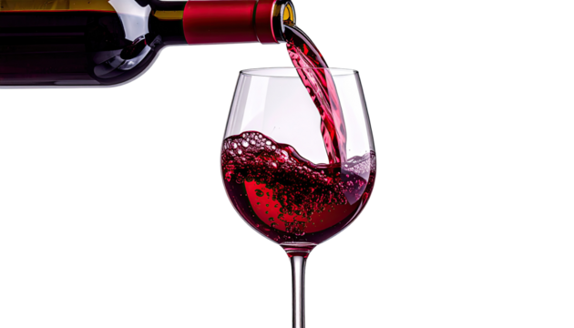 Pouring Red Wine in Glass with Splash Against Transparent Background