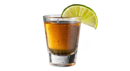Short glass of whiskey with lime wedge and condensation drink alcohol isolated on a transparent background