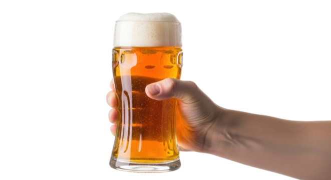 A hand holding a tall glass of beer against a white background.