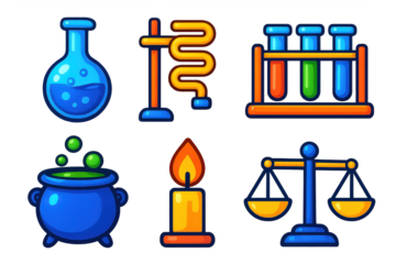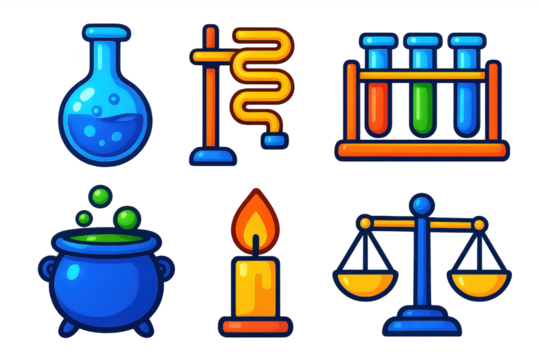 Vibrant Laboratory Icons. 3D icon set of laboratory objects: alembic flask, distillation coil, test tube rack, bubbling cauldron,