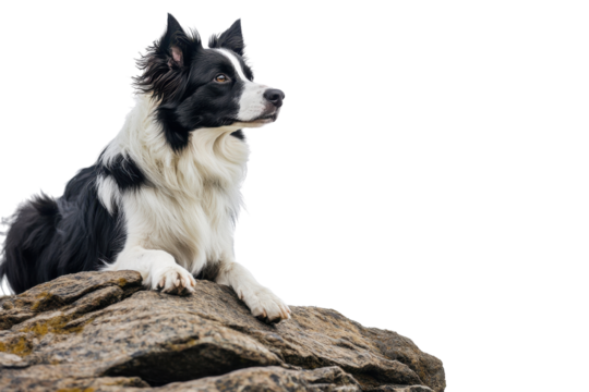 Black and white dog sitting on rocks, looking into the distance. Perfect for animal, pet, and outdoor themed content cut out transparent isolated PNG