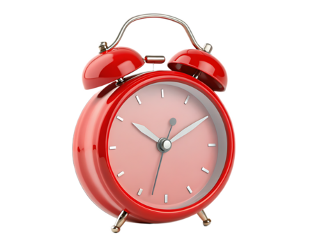 A simple white alarm clock with a blank face and black hands standing on a bright white background.