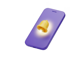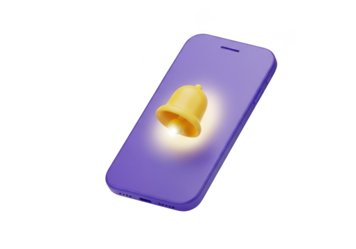 3d icon of a purple smartphone displaying a glowing yellow notification bell icon isolated on transparent background